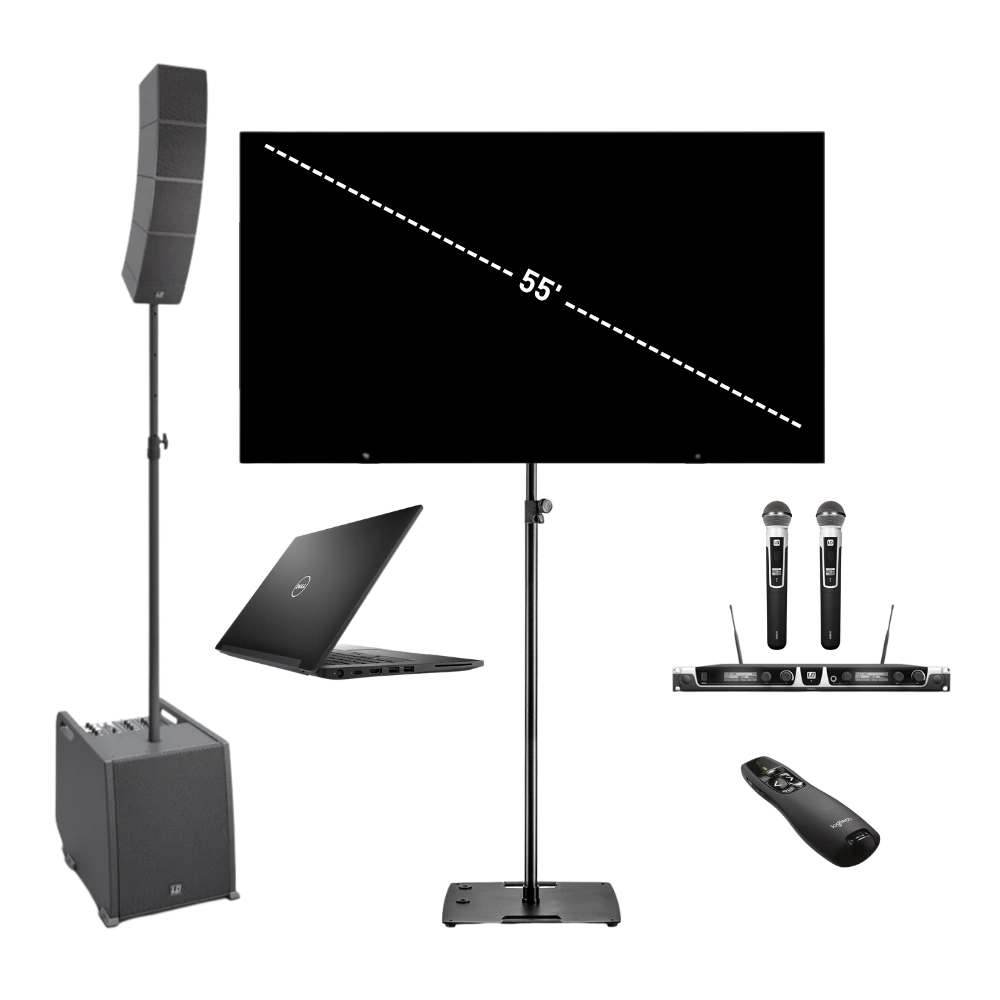 De Presentatie Set 2 is een complete set voor presentaties en vergaderingen. De set bevat een 55 inch 4K LED TV op een verrijdbaar statief. Het LD Systems Curv 500 ES geluidssysteem biedt helder geluid, ideaal voor spraak, met ondersteuning voor Bluetooth en USB. Een laptop wordt meegeleverd om eenvoudig presentaties te starten, samen met een Logitech presenter voor probleemloze bediening. Het draadloze LD Systems U500 BPH microfoonsysteem biedt bewegingsvrijheid tijdens je presentatie.
