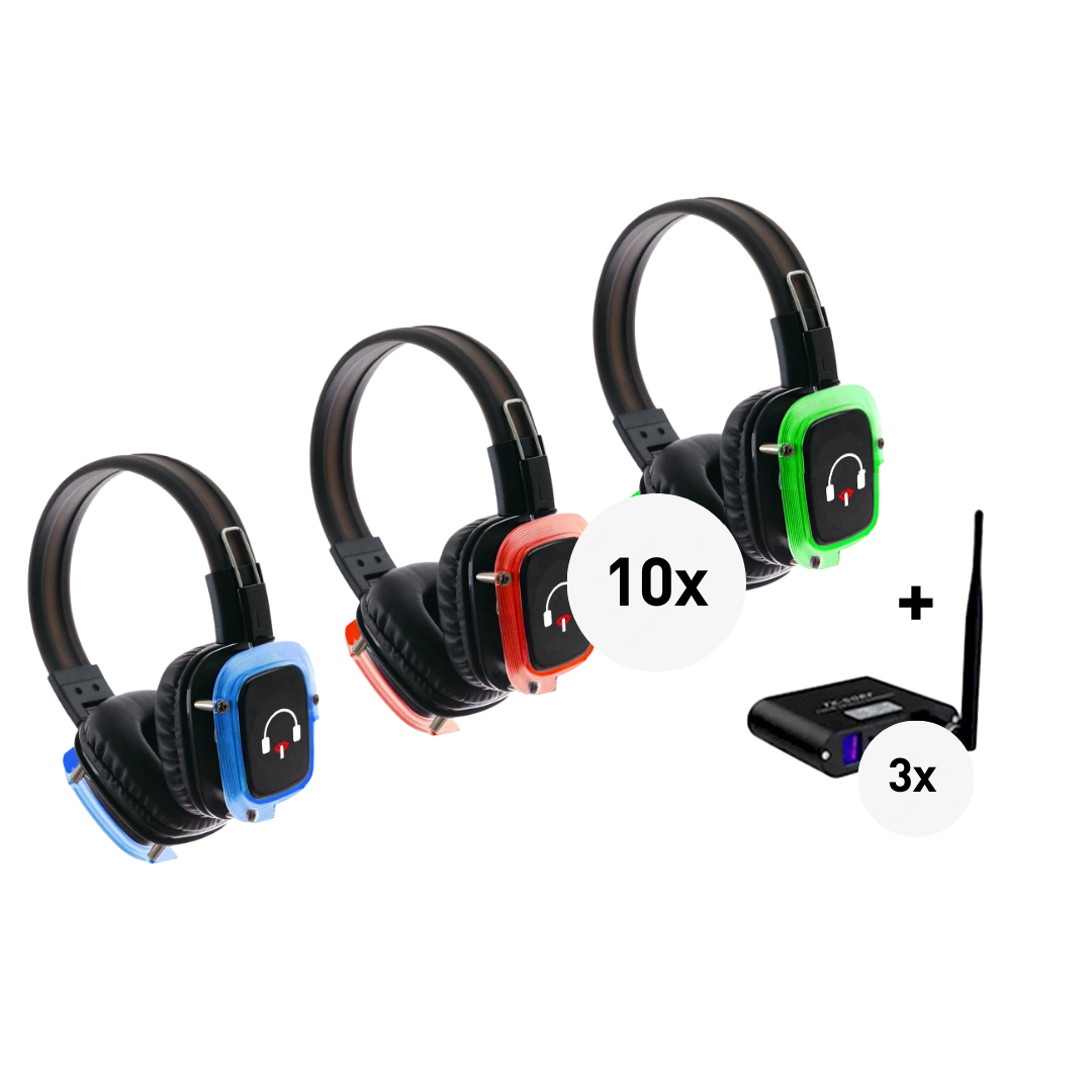 De meest gebruikte en beste silent disco headsets op de markt, eenvoudig verstelbaar en geschikt voor diverse hoofdmaten. Met deze koptelefoon kunnen tot 3 verschillende muziekbronnen tegelijk worden beluisterd. Elke muziekbron vereist één zender. Deze set wordt geleverd met het maximaal aantal zenders: 3. Op de koptelefoon bevinden zich een aan/uit-knop, een volumewieltje en een kanaalknop met de kleuren Blauw – Rood – Groen, die corresponderen met de beschikbare kanalen. Let op: zorg ervoor dat de zenders niet op hetzelfde kanaal staan om storing te voorkomen. De koptelefoons gaan ongeveer 10 uur mee en worden schoon en volledig opgeladen geleverd.